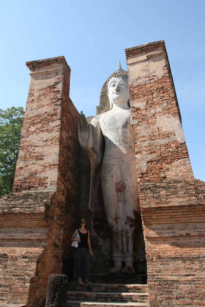 This morning we got up early, hired a motorbike and headed out to explore the 13th Century ruins of old Sukhothai. Sukhothai was the first capital of Thailand and the ruins are spread across 70 sq km with over 100 historical sights including royal palaces, temples, the city gates, walls, moats etc. Needless to say it was pretty impressive and filled our day! Unfortunately the serenity was disturbed on occasion by hoardes of school children on day trips… it’s quite a terrifying experience having 60 odd children in purple tracksuits on bicycles speeding towards you shouting ‘hello’ and laughing hysterically when you reply!