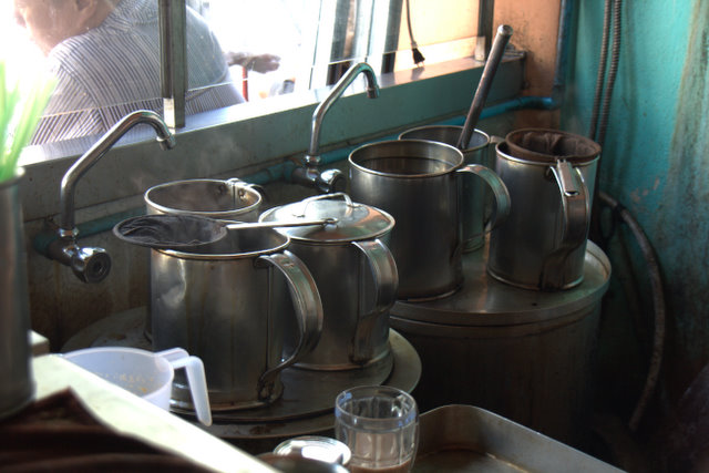 The following day we braved a long walk down to Chinatown, passing through an odd street which seemed to only have two types of shop – unfortunately we weren’t on the lookout for a guitar or any army supplies, so we moved on. Starting the tour at Hualamphong Station, Bangkok’s biggest train terminal, we headed into some packed market alleyways filled with everything you could think of. The density of the people was highlighted every time a motorbike slowly tried to cut its way through the crowd which could barely move anyway. The tour guided us to a small street with an open fronted cafe filled only with old Chinese men. We read the description of the place and still managed to walk past it twice before deciding that it must be it. This was La Sae and is one of the city’s oldest coffee houses. Feeling very out of place we stepped in, were greeted warmly and were offered a seat amongst the regulars. From my seat I could see that they were brewing their coffee in tall steel pots with the coffee hanging into the water in what looked like a child’s fishing net. We opted for a standard black coffee, which turned out to be one of the strongest, thickest and sweetest coffees we’ve ever had – this caffeine hit would last us for the rest of the day. Amazingly it was also one of the cheapest coffees we’d had in Thailand. It was clearly a place that hadn’t changed in ages, and a place that made me want to be able to speak just a little Mandarin so I could tap into the hundreds of years worth of experience and stories, some of which were probably the subject of conversation at the time, well… for the few of the guys that weren’t talking about us.