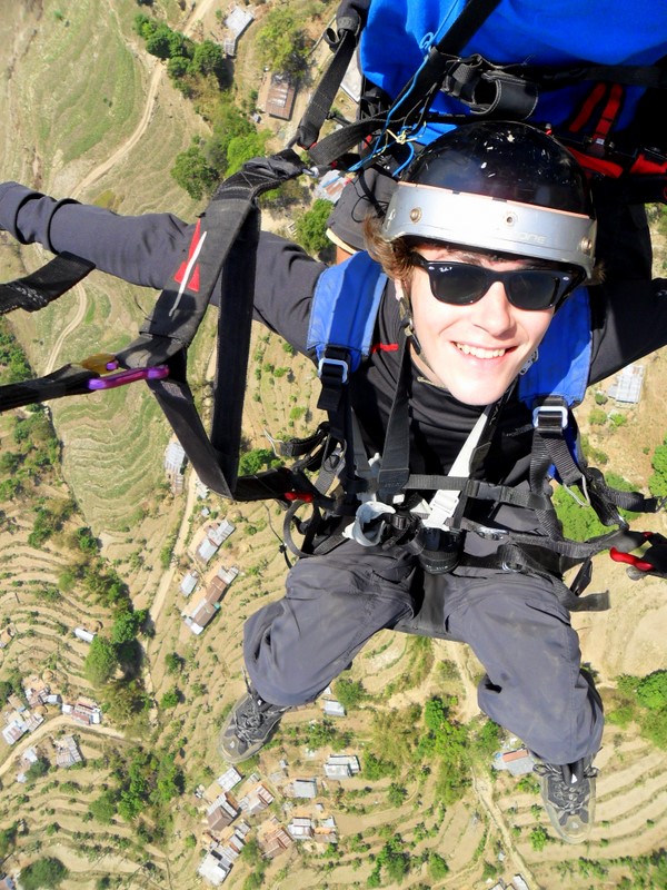 We were driven by jeep to the top of Sarangkot, one of the big hilltops surrounding Pokhara, and assigned our pilots. Alexandra took off first with her Czech pilot and I followed with my French pilot (who oddly had the same name as my mum, Flo, but thankfully short for Florent rather than Florence as he was a bloke). It was a great experience. Flo told me all about how to look for thermals and taught me how to steer into them and stay in their core. We ended up spending most of our time as the highest pair in the air and we were fortunate to see yet another stunning Nepali view. Pokhara and the lake were below us and to the south, and the Annapurna mountain range (which had finally revealed itself from behind the mist for the first time since our arrival) was to the north. Flo finished off the ride by taking us over the lake and making a speedy descent with a bit of aerial acrobatics. He did some swinging from left to right, which was a bit sickening, and then switched into a huge downward spiral which had us flying almost horizontally as we dropped. He then finished the ride with a perfect landing next to the lake!